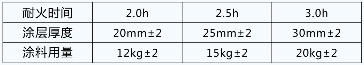 五、耐火時間和涂層厚度及涂料用量參考下表: